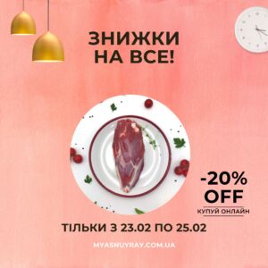 АКЦІЯ – 20% на ВСЮ продукцію М’ясний Рай! Акція діє з 23 по 25 Лютого, тільки в магазині за адресою Київ, Генерала Алмазова, 2, м. Печерськ.