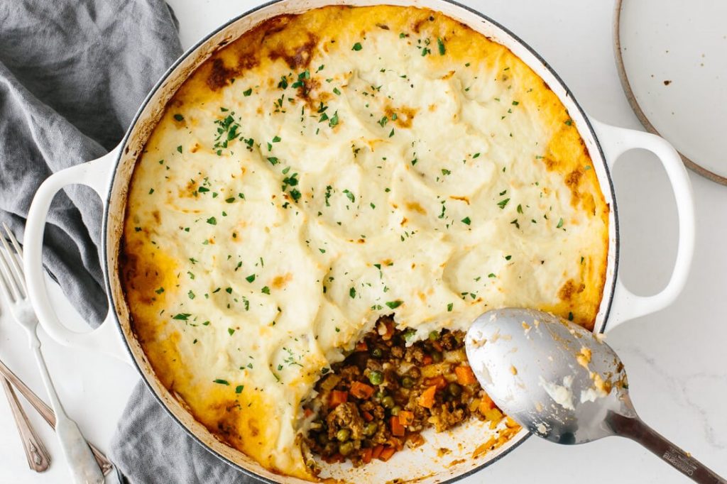 Ніжний фарш, обсмажений з овочами під повітряним картопляним пюре – що може бути краще? Це традиційна британська страва, в якій (в класичному її варіанті) застосовувалася баранина. Використовуючи будь-яке інше м’ясо, пиріг слід називати «сільським» або «котеджним». Це пов’язано з появою в меню бідняків, які проживали в котеджних будиночках для робітників, картоплі. Саме вчорашня картопля і залишки м’яса від вечері використовувалися для цього пирога.